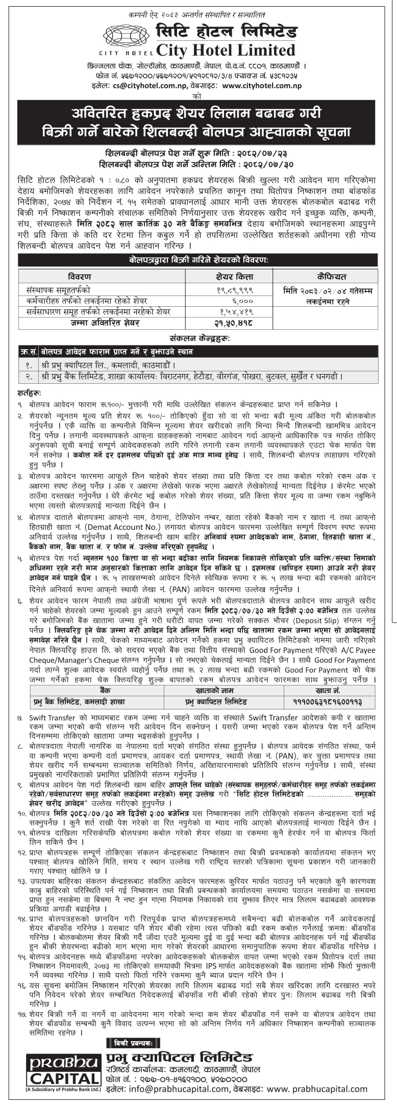 काठमाडौं । सिटी होटल लिमिटेडले कम्पनीको अवितरित हकप्रद शेयर शिलबन्दी बोलपत्रका माध्यमबाट लिलाम बढाबढमा बिक्री गर्ने भएको छ ।