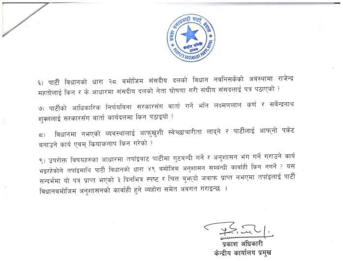 ६. उपरोक्त विषयहरूका आधारमा तपाईंबाट पार्टीमा गुटबन्दी गर्ने र अनुशासन भंग गर्ने गराउने कार्य भइरहेको तपाईंमाथि पार्टी विधानको धारा ४९ बमोजिम अनुशासन सम्बन्धी कारवाही किन नगर्ने ? यस सन्दर्भमा यो पत्र प्राप्त भएको ३ दिनभित्र स्पष्ट र चित्त बुझ्दो जवाफ प्राप्त नभएका तपाईलाई पार्टी विधानबमोजिम अनुशासनको कारवाही हुनेछ ।