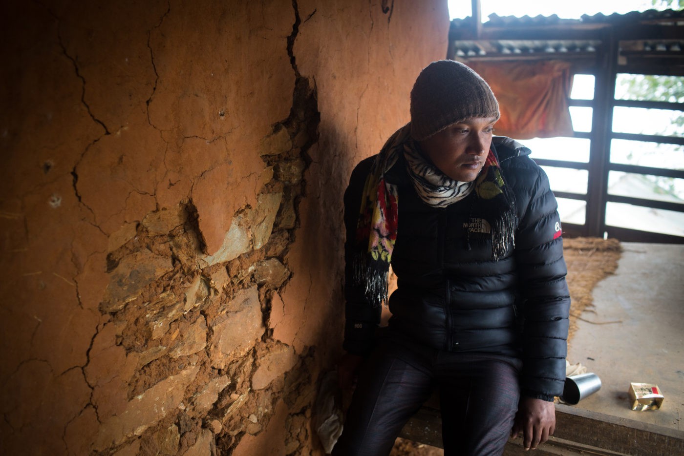 धादिङको गाउँ घुम्तीस्थित आफ्नो घरमा कृष्ण माझी । सन् २०१५ को भूकम्पका कारण घरका भित्ता चिरा परेका छन् । तस्बिर : नवीन बराल/द थर्ड पोल)